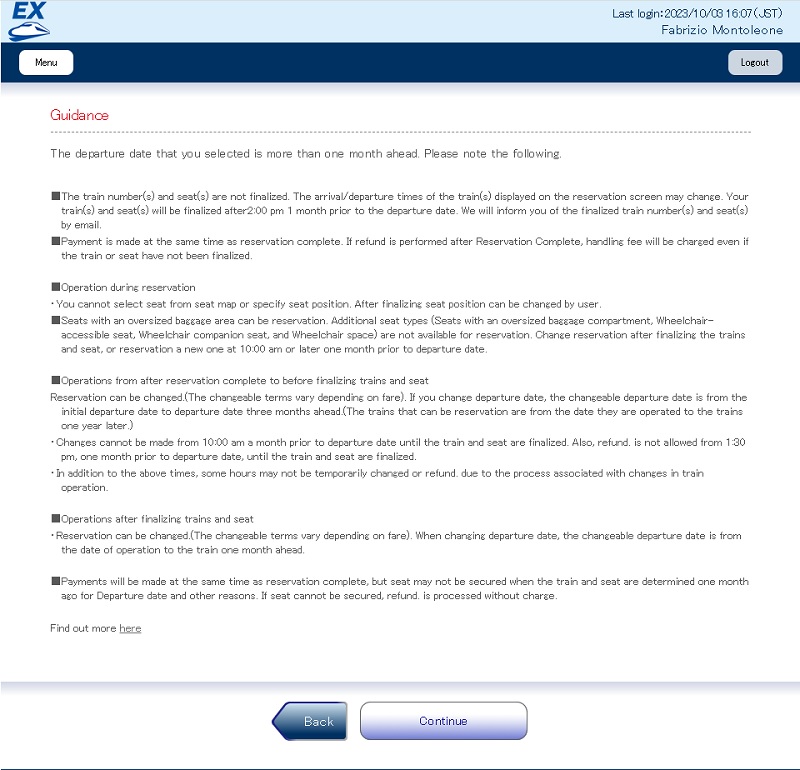 In questa schermata potete scegliere la data e l’ora del viaggio, il tragitto che vi interessa (tra Tokyo e Chuo-Kagoshima), biglietto di sola andata o andata e ritorno, numero di persone. Dopo aver fatto la nostra scelta, cliccare su “Continue”.